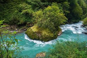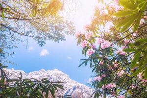 的喇叭河暗香浮动、鸟语花香、犹如一个姹紫嫣红的美丽花园。峡谷中,河滩上,到处开满了各种野花,高山杜鹃,红的象火,白的象雪,粉的象霞,叫得出名的,叫不出名的全都努力绽放。