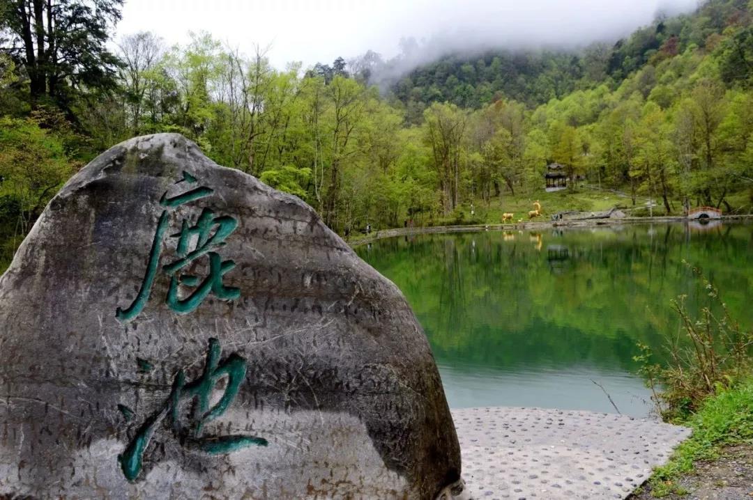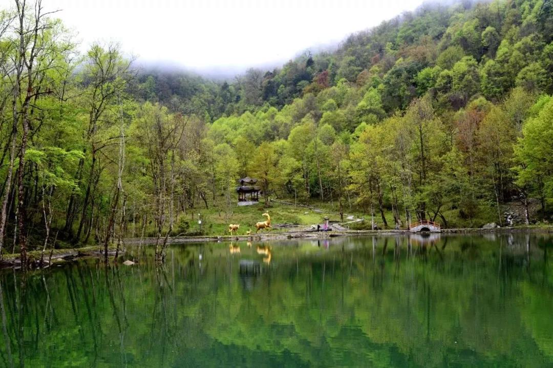 整个鹿池被青山绿树所包围,林间有经历几百年风吹日晒而生机盎然的铁杉,绕湖游道蜿蜒盘旋,迂回纵深,曲径通幽。